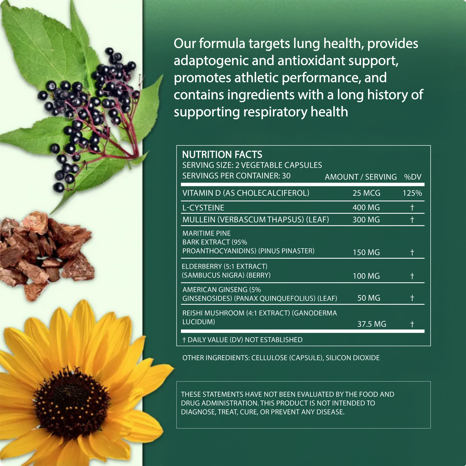 Key Ingredients: Mullein leaf, Reishi mushroom, Vitamin D, Elder berry, American ginseng, Pine bark extract and L-cysteine.